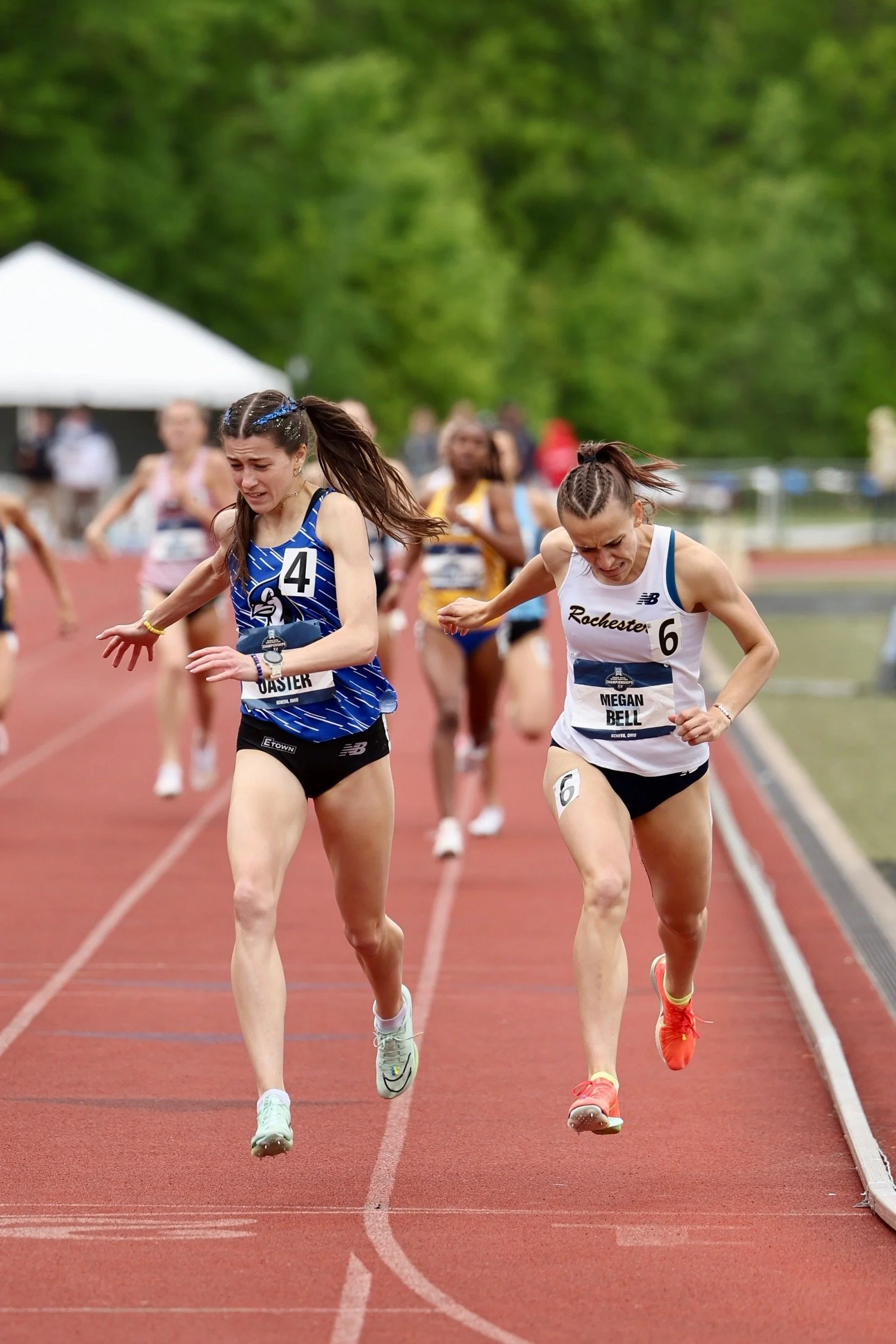 Bell began a hard kick in the final 100m, seemingly taking Oaster by surprise as she began to fall off of Bell’s shoulder momentarily. With 50m to go, Oaster regained her momentum and the two ran stride-for-stride down the homestretch. As the pair lunged for the finish, it was Oaster who had just enough left to snag the title. The battle for first pushed both athletes to the No. 6 and No. 7 fastest women’s 800m performances in D3 history.