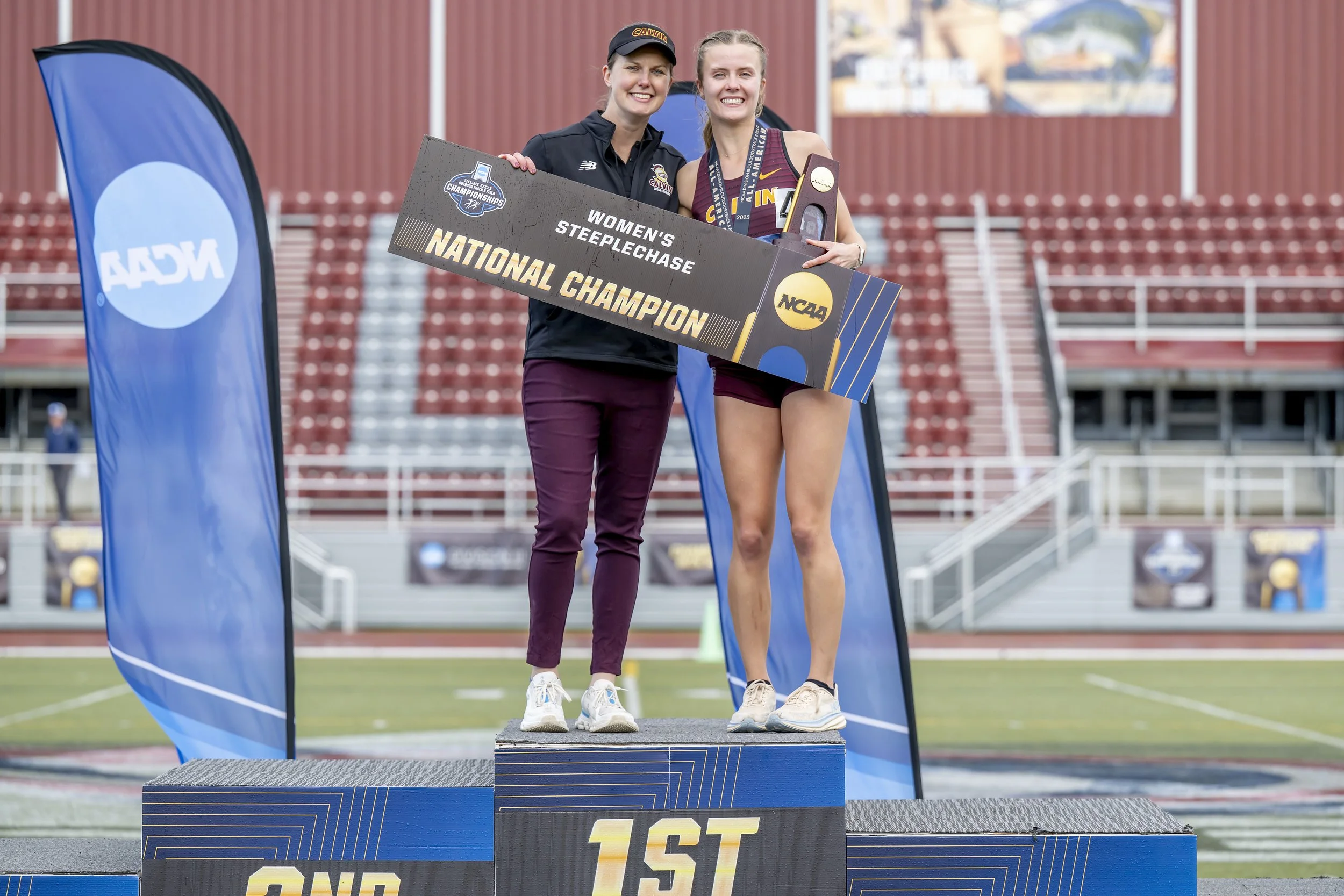She follows directly in the footsteps of her own college cross country coach, recent 2025 USTFCCCA Coaches Hall of Fame inductee Brian Diemer, who coached cross country and distance athletes at Calvin for 36 years. With the help of co-pilot Al Hoekstra, 2021 USTFCCCA Hall of Fame inductee and Women’s Head Cross Country Coach until 2005 Nancy Meyer, and longstanding assistant since 2005 Rick Otte, Diemer’s Knights saw a wealth of success. They earned four men’s national titles, 30 combined national top-10 finishes, 16 combined national top-4 finishes, 36 combined Great Lakes regional titles, and 43 combined MIAA conference titles, the most titles in MIAA history.